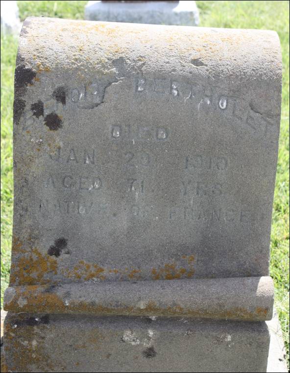 Benoit Bertholet was born in Alsace-Lorraine, France. (Lyon, France, according to his obituary.) He served in Algiers, Morocco, in the Foreign Legion; and then he served in the French Army in Mexico under Maximilian. After he was discharged from the Foreign Legion, he immigrated to New York; Boston, Massachusetts, which is where it appears that he married his wife, Zelia Bertholet. He then moved his family to Chicago, Illinois, and then on to Sacramento, California, where he worked on the stone work at Folsom Prison and the historic California State Capitol. After Sacramento, he moved his family to the San Francisco Bay Area where he worked on Mare Island and spent several years in the Richmond district of San Francisco. By the 1880 federal census, he had moved his family to Alameda, Alameda County; and they later moved to Winters in Yolo County.