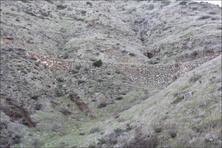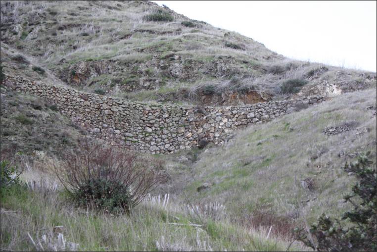 “Retaining walls are constructed for road support and erosion control. The early records of the various ranch foremen describe these projects. The stone retaining wall supporting the road out of Scorpion Valley towards Smugglers Cove is notable for massive size, the large size and number of rocks used to build it, and the difficulty of constructing such a large structure in its steep hillside location. Walls are still visible today along the Scorpion and Smugglers stream beds and along the Cavern Point trail.