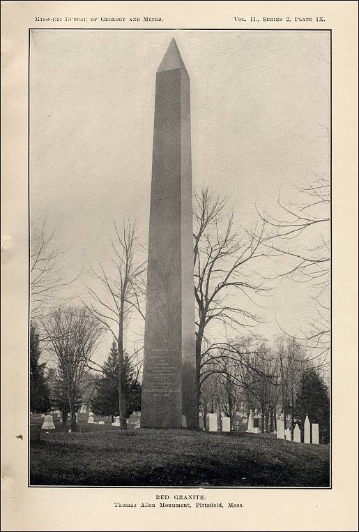 “Graniteville. The largest and most important quarries in the state are here. The stone is a red granite of pleasing red color, medium to coarse grained....” “Blocks of large size can be extracted, and columns 16 feet long and 2 feet 6 inches in diameter have been obtained.” Granite quarried at Graniteville, Missouri, was used to create the polished monolith of 42 tons weight in Pittsfield, Massachusetts. (The author does not note where this column was placed in Pittsfield. ).
