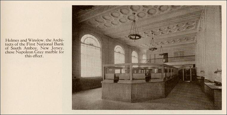 South Amboy, New Jersey – First National Bank Building Interior – the Counter Screen & Wainscot (from Napoleon Gray, An Adaptable Marble, Phenix Marble Company, Kansas City, Missouri, Producers, and Tompkins-Kiel Marble Company, New York City, New York, Distributors, 1926, pp. 42)
