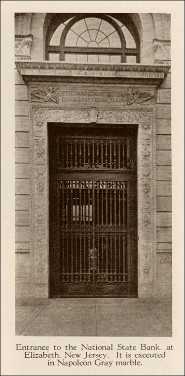 Elizabeth, New Jersey – the National State Bank – the Front & Interior (from Napoleon Gray, An Adaptable Marble, Phenix Marble Company, Kansas City, Missouri, Producers, and Tompkins-Kiel Marble Company, New York City, New York, Distributors, 1926, pp. 16, 45, & 51)