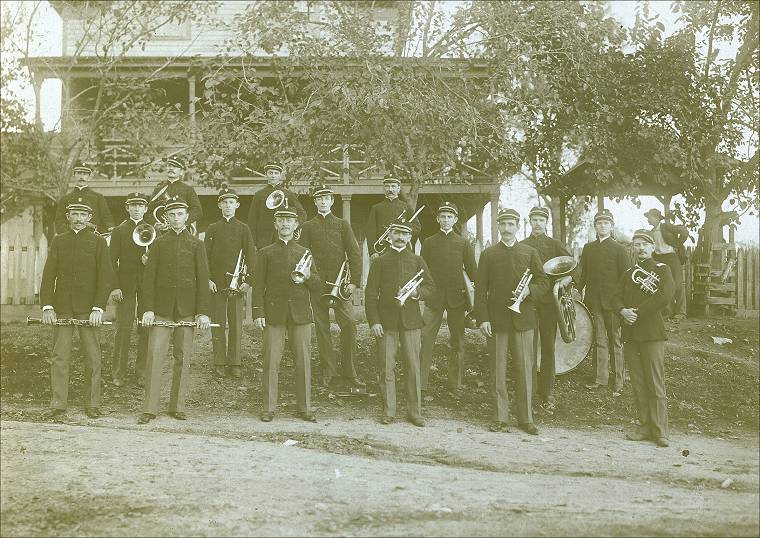 | This is a photograph of the Penryn Granite Workers Band circa 1890-1895. The men in the photograph are not identified; but if you know who any of them are, please contact me and we’ll fill in their names. This photograph was contributed by Diane Cox. Peggy B. Perazzo | ![]() |