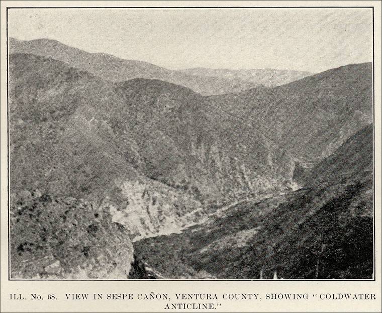 “In this locality the Sespe River cuts across the ‘Coldwater Anticline,’ with its axis nearly east and west, dipping toward the east. The brown sandstone is exposed on the crown and on both sides of the axis on both sides of the river. It is also exposed in the several small tributary cañons, such as Coldwater Cañon, east of the river. In places, as at the ‘Devil’s Gate,’ and below, the shearing planes developed by the folding are more prominent than the bedding planes and in places cut the stone into small dimensions. On the north side of the axis the stone does not appear to be at all shattered, and occurs in heavy massive beds, with two sets of nearly rectangular joint planes, so that it lies in huge cubical blocks which have a gentle dip to the north and east.