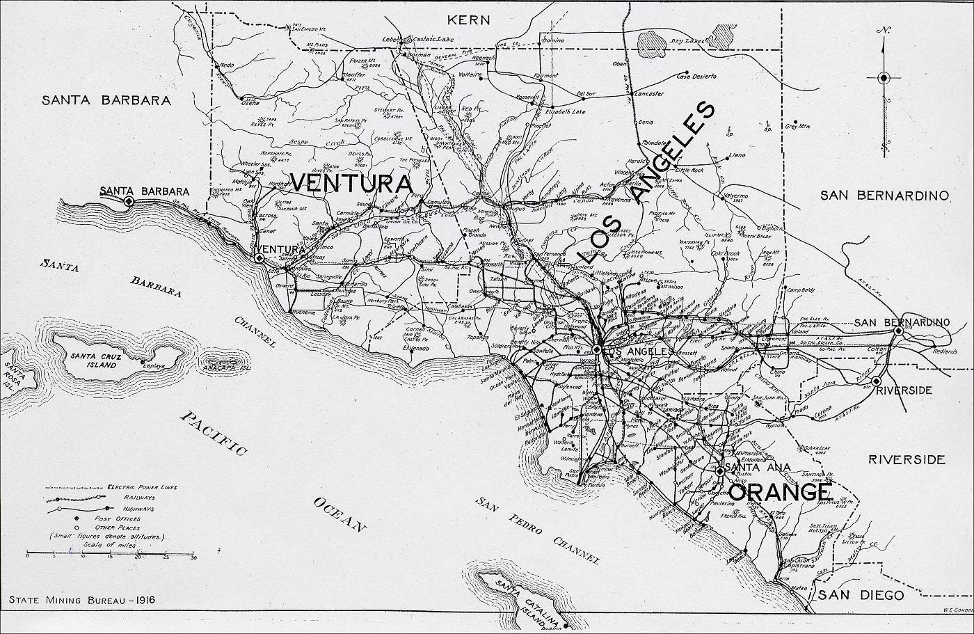 “The county is traversed by the S. P. R. R., with a branch line from Ventura to Nordhoff. At Montalvo, five miles east of Ventura, the main line divides into two branches, one going to Los Angeles via Las Posas and Simi Valleys, the other through the Santa Clara Valley, joining the San Joaquin Valley line at Saugus. The northern portion of the county is extremely inaccessible, only a few trails penetrating this mountainous region from the south. Access to the gold and borax districts is obtained over the new State Highway from Bakersfield to Los Angeles via the Tejon Pass. A fine line of automobile stages over this highway now makes those districts easily accessible.