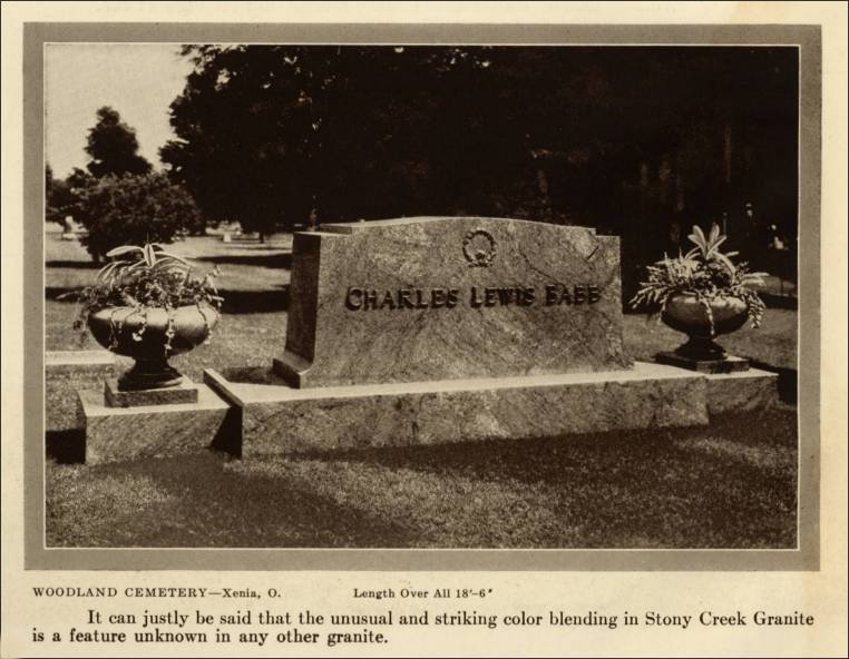 | “Woodland Cemetery, Xenia, Ohio. Length over all 18’ – 6’. It can justly be said that the unusual and striking color blending in Stony Creek Granite is a feature unknown in any other granite.” |