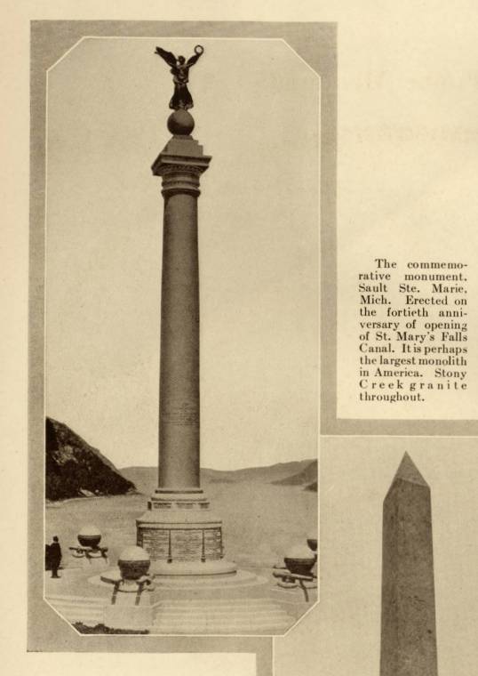 | “Lakeview Cemetery, Cleveland Ohio. Professor Herman Matzen, Cleveland, Designer. The ‘White’ Memorial presents Stony Creek Granite and Bronze in a beautiful combination. The illustration but faintly shows the unusual veining and mottling in the granite.” |
