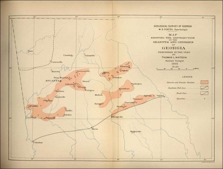 - Georgia - Map Showing the Distribution of the Granites and Gneisses of Georgia, from A Preliminary Report on a Part of the Granites and Gneisses of Georgia, Bulletin No. 9-A, by Thomas L. Watson, Ph.D., Assistant Geologist, Geological Survey of Georgia, 1902, pp. 88.