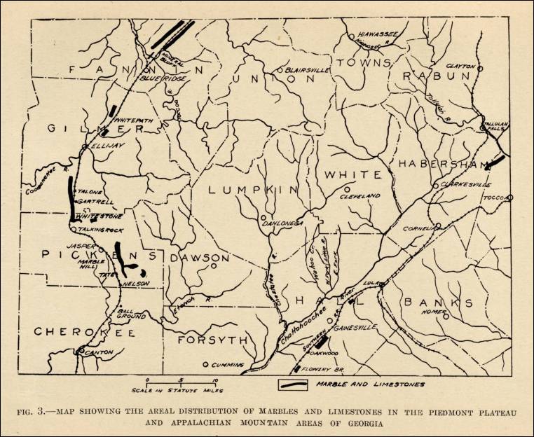 | Fig. 3. Map showing the areal distribution of marbles and limestones in the Piedmont Plateau and Appalachian Mountain areas of Georgia (circa 1912) |