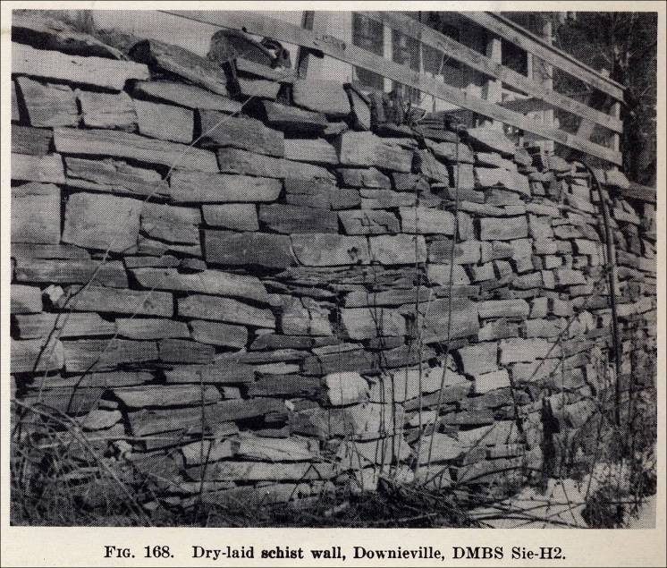"Schists of the Calaveras, Cosumnes, and Mariposa series as well as some similar formations of earlier age are extensively used as building material. Their especial virtue lies in the fact that they usually have well defined horizontal planes of cleavage which permit the detachment of large, even surfaced slabs which can be used with very little dressing or shaping (cf. Figs. 13, 26). When used for fences or retaining walls, they are often dry-laid (cf. Figs. 25, 168), but in buildings they are usually set in mortar of mud or lime. When the vertical plane of cleavage is definite, it is set toward the exterior. The rough, vari-colored appearance f schist walls was not always appreciated by the early builders and most schist buildings have facades of brick, (Fig. 42) or of dressed blocks of ornamental stone (mostly rhyolite tuff) and the other walls are heavily coated with lime stucco. That the use of schist as a structural material is confined to those towns where it is available in the immediate locale, indicates that it was employed because of convenience rather than preference. Representative schist buildings are illustrated in Figs. 12, 33, 46, and 126.
