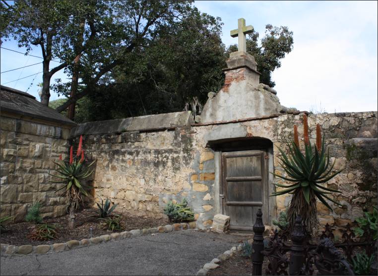 Sandstone and mortar fence and wooden gate in the Santa Barbara Mission Cemetery with cross atop the gate |