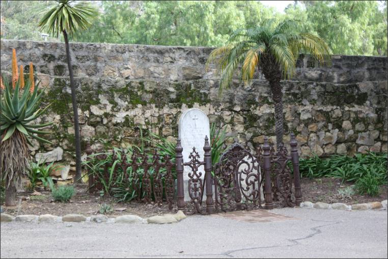 Marble cemetery stones in enclosed iron fence in the Santa Barbara Mission Cemetery |