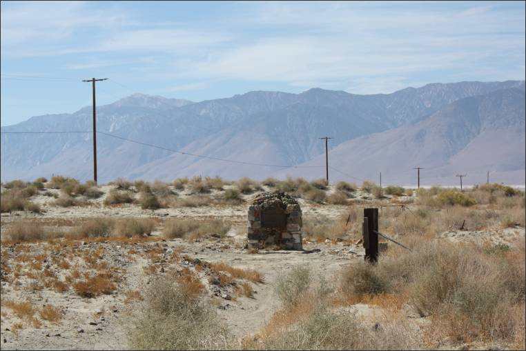 The monument and what little that remains of Swansea is located about 10 miles south of Lone Pine along Highway 136. More historical information and photographs are available on the “Swansea Ghost Town” on ghosttowns.com and “Swansea, California” on Wikipedia. A transcription of the plaque on the monument is located near the bottom of this page. (The following photographs were taken by Peggy B. and Pat Perazzo in late September 2011.)