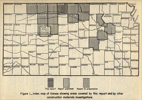 Figure 1. Index map of Kansas showing areas covered by this report and by other construction materials investigations. |