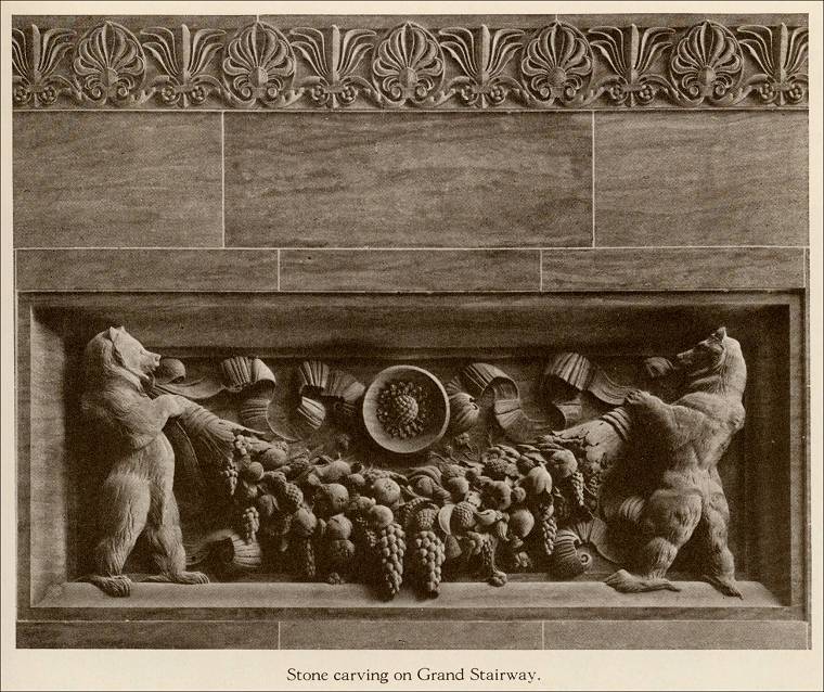 “Throughout the building there is an abundance of carving in the handsome stone work, especially in the capitals of the exterior columns, and on the walls near the grand stairway. This carving cost the State $75,000, and the contractor at the time claimed it cost him $48,000 more than this.
