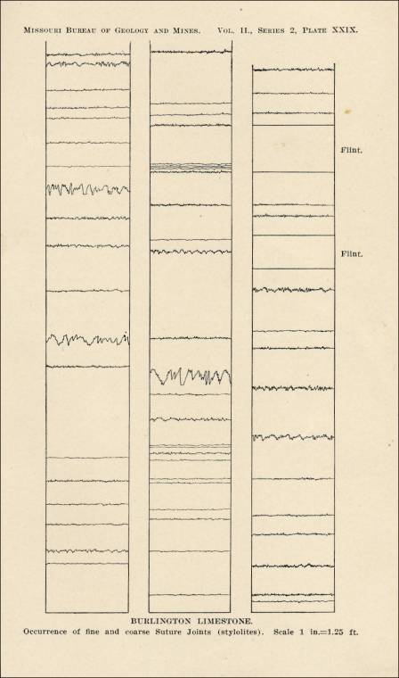 “Stratification planes, having the appearance of the joints in the cranium, which occur in this stone, were called suture joints by the earlier geologists. Later, these became known as stylolites. In this report we have chosen to call them suture joints. In the Carthage limestone, suture joints occur parallel to the bedding and are from two to twenty inches apart. They vary greatly in size, some of them being as much as four inches deep. The smallest of these joints are tight and the stone cannot be split along them as one might suppose. The larger of these joints are frequently open and along them the stone is usually easy to split. These seams injure the appearance of the stone when they occur on a sawed face. To avoid this, the stone is generally sawed parallel to the bedding and laid on edge in the wall. The so-called number one stone, or monumental stock, contains none but the very finest suture joints. An examination of the outcrops show that these joints will open after long exposure to the weather, separating the stone into thin layers.