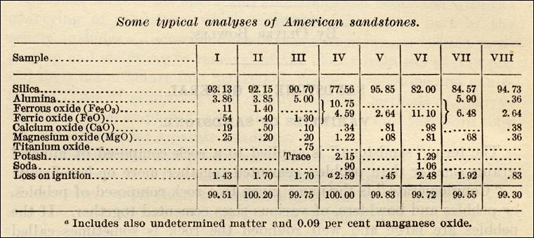 “The presence of alumina, together with potassium or sodium, or both, indicates that feldspars are probably present. Alumina without the alkalies indicates the presence of clay. A calcium or magnesium content indicates that the carbonates of calcium and magnesium form cementing material between the grains of sand, except where sufficient plagioclase, biotite, or hornblende are present in the rock to account for these constituents. Analyses V and VIII indicate the comparatively small percentage of iron oxides that can cause deep coloration....”