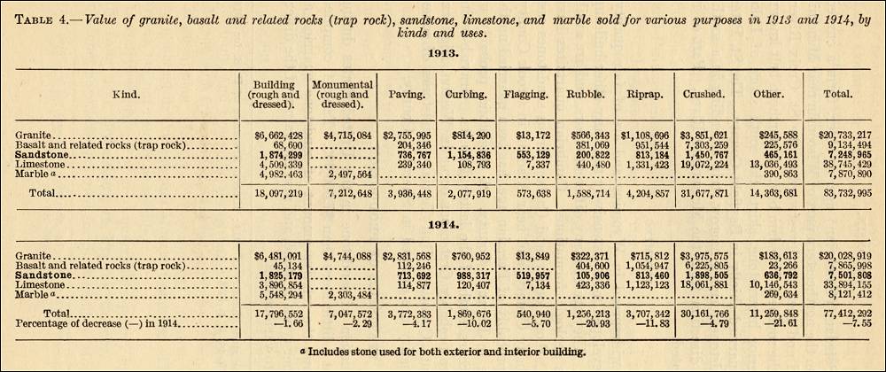 | Table 4. Value of granite, basalt and related rocks (trap rock), sandstone, limestone, and marble sold for various purposes in 1913 and 1914, by kinds and uses. | ![]() |