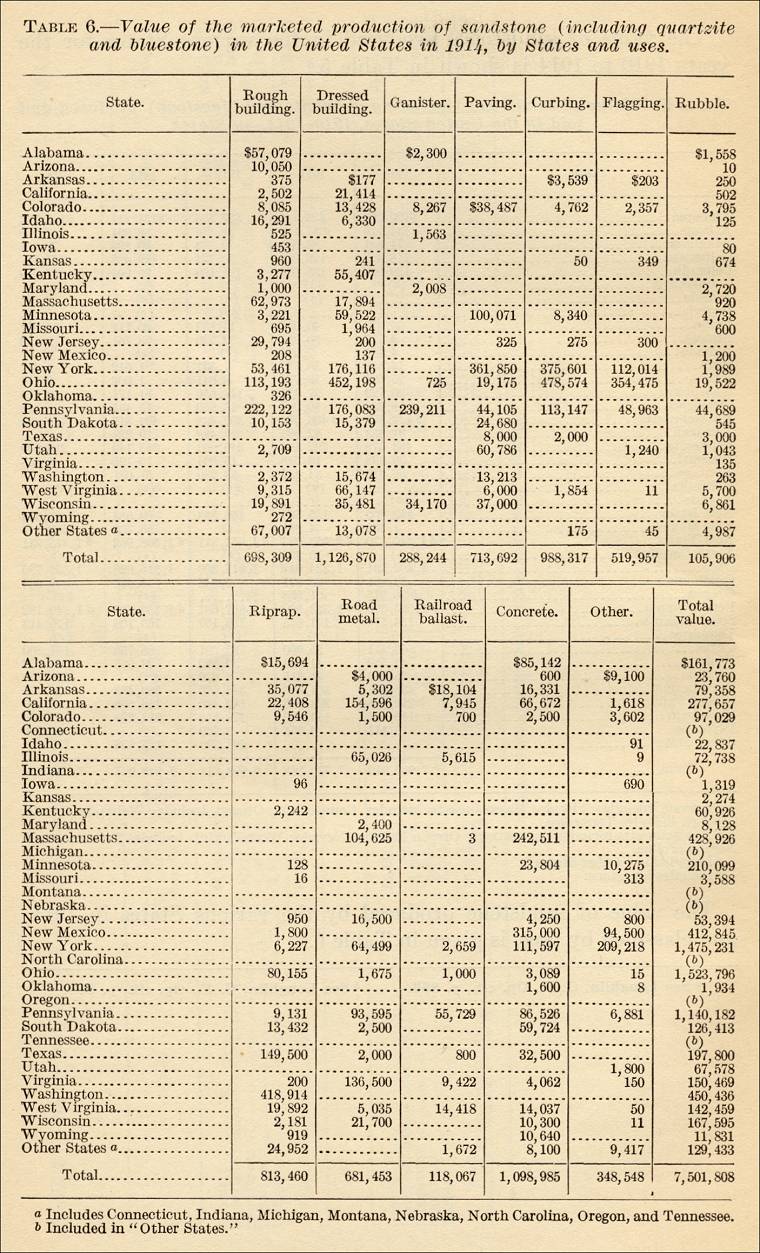“The total production of sandstone in the United States during 1914 was valued at a little more than $7,500,000. Table 4, compiled by Loughlin,* shows the relative amount of sandstone quarried as compared with other types of stone, and also the values of the different rocks devoted to various uses.”