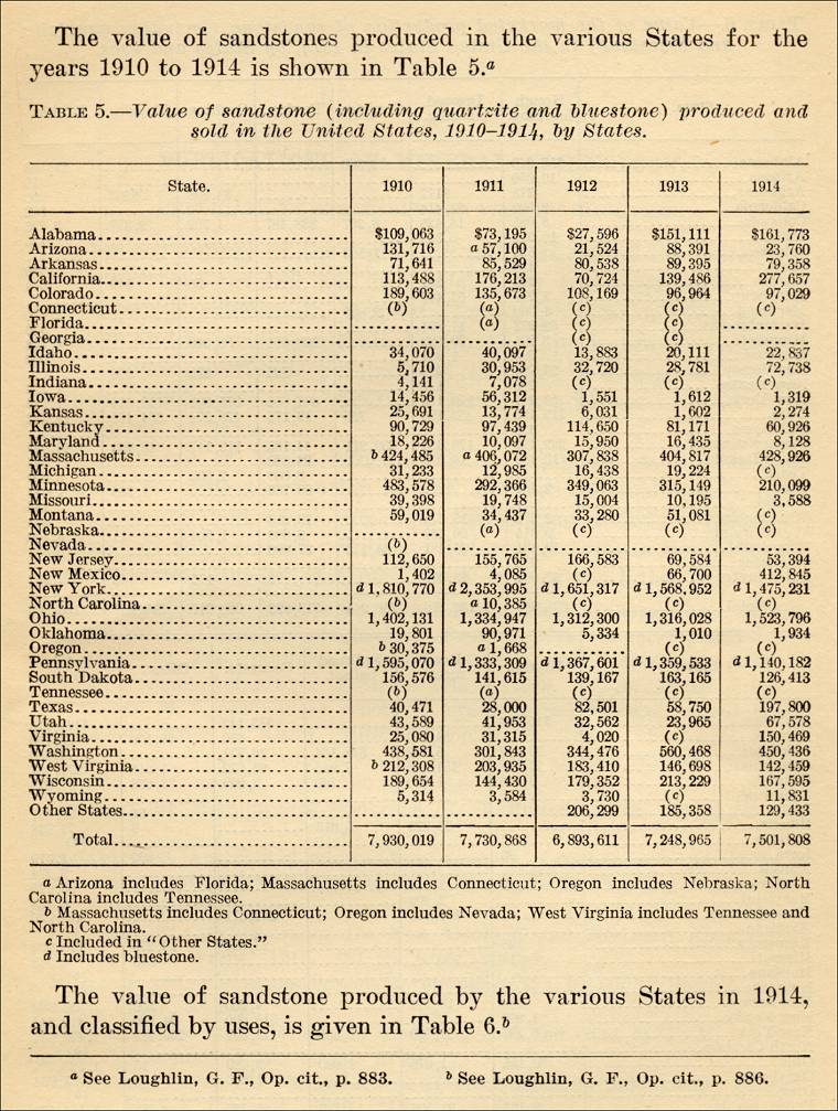 “The value of sandstones produced in the various States for the years 1910 to 1914 is shown in Table 5.*