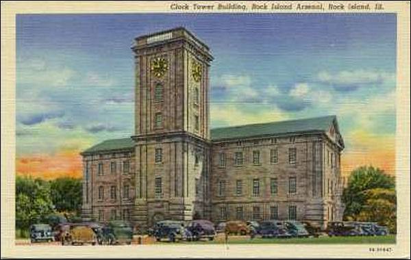 Rock Island, Illinois - the Clock Tower Building, Rock Island Arsenal, Rock Island Ill. (colorized postcard photograph, #9A-H1647; published by Curteich; unmailed; the building was constructed with limestone quarried in LeClaire, Iowa.